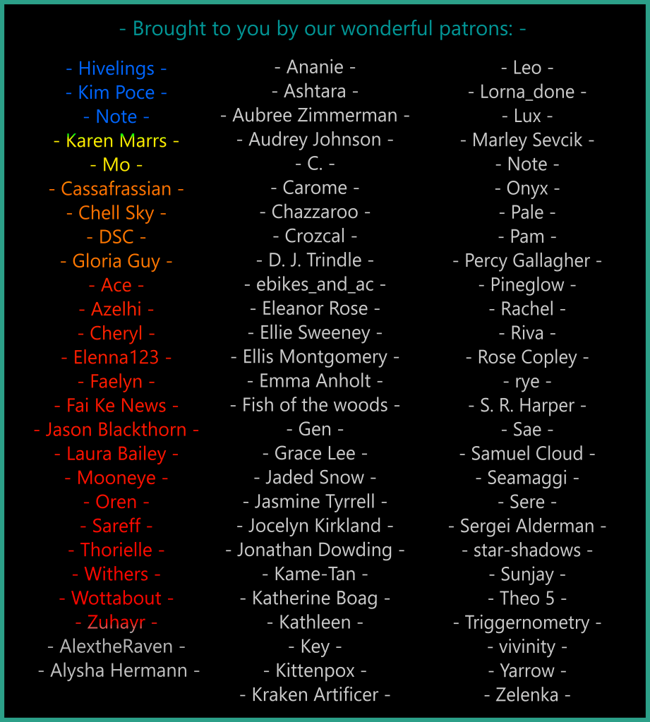 “I think… that we don’t know much about how Amy thinks, specifically, and that could kill us. And we don’t know much about why Zale had a bad cranial port even though they weren’t a ten per center, and that could kill more colonists if we don’t know how much danger they’re in or what’s going on. And we don’t know what was tampered with under the hull of the chronostasis ring, which leads into the other two things and suggests there might be dangers left over from the crew 1 people still in chronostasis if there was some kind of weird brain hijacking conspiracy or experiment or something, and we can’t get some systems of this ship working right because we don’t know Reimann’s password and statistically it’ll take me one hundred and seventy three years to brute-force it with the lockout after limited attempts, and we don’t know why the bodies in Chronostasis Ring 1 didn’t decay like they were supposed to. I woke up and came out of that ring alive but nobody else did. Of all the things we don’t know on this ship, not knowing if Sands is gonna do something stupid is the thing least likely to kill us. We have more people to help figure this all out now, so why would we not do that? If Sands does something, stupid Denish can just overpower him. Denish can’t overpower Amy.”
